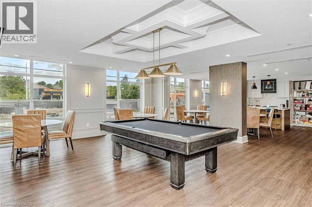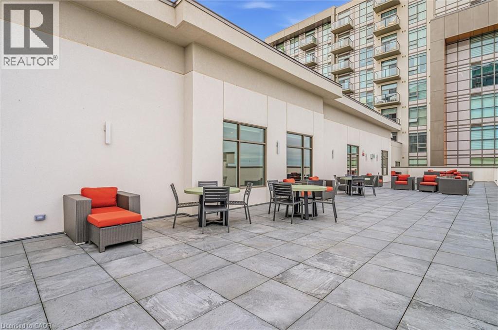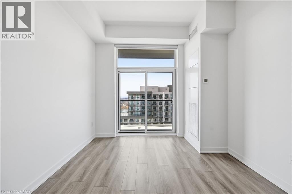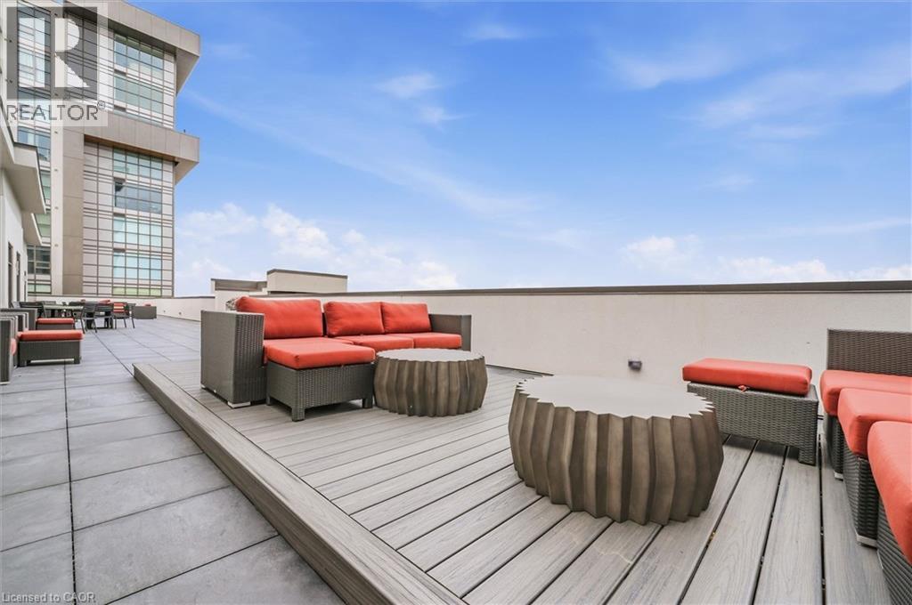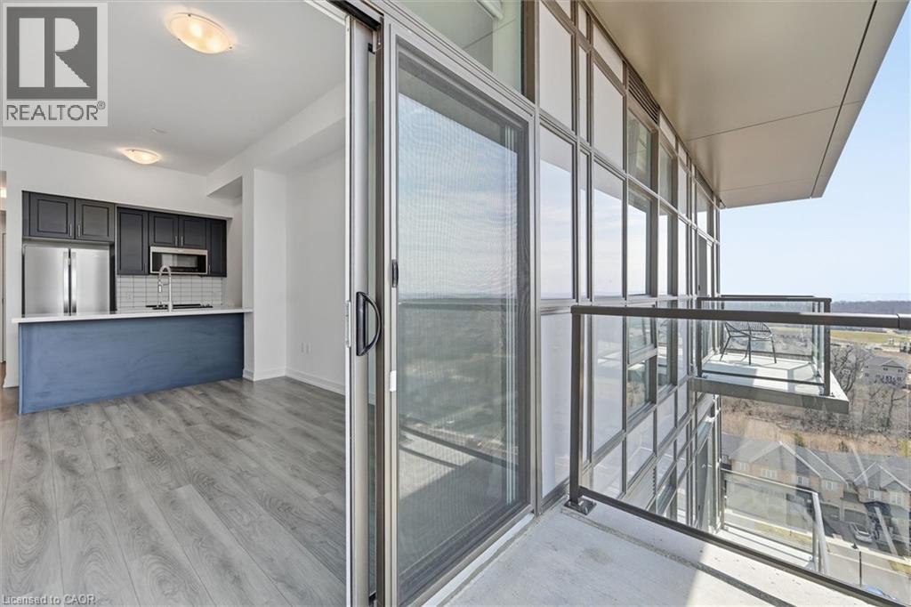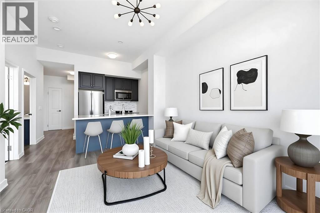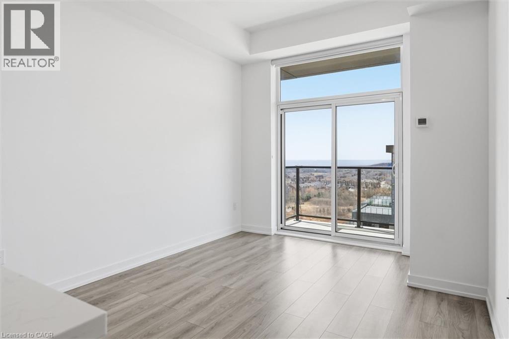 Experience elevated living in this stunning penthouse retreat perched on the top floor, offering 638 square feet of thoughtfully designed space. This 1 bedroom plus den residence impresses with soaring 10-ft ceilings and an abundance of natural light streaming through floor-to-ceiling windows. Step out to your private balcony and take in sweeping southwest panoramic views over the east end of Waterdown-the perfect backdrop for morning coffee or evening sunsets. The suite is loaded with quality upgrades, including custom navy cabinetry, gleaming white quartz countertops with an extended breakfast bar, upscale stainless steel appliances, a timeless subway tile backsplash, and top-of-the-line vinyl flooring that blends durability with contemporary style. Residents enjoy exceptional building amenities, including a rooftop terrace with BBQ, stylish party room, fully equipped gym, and convenient bicycle storage locker. Geothermal heating/cooling ensures energy efficiency and low utility costs year-round. Complete with 1 underground parking space and 1 storage locker, this residence offers comfort, convenience, and sophistication. This is more than a home-it's a lifestyle at the top, where modern design, smart efficiency, and breathtaking views come together seamlessly. (id:64869)