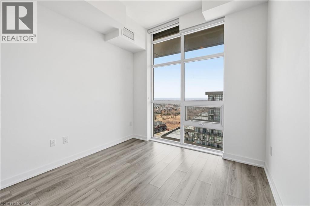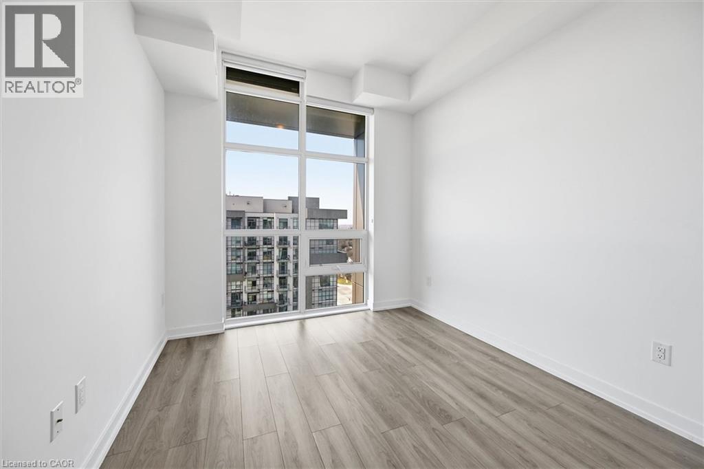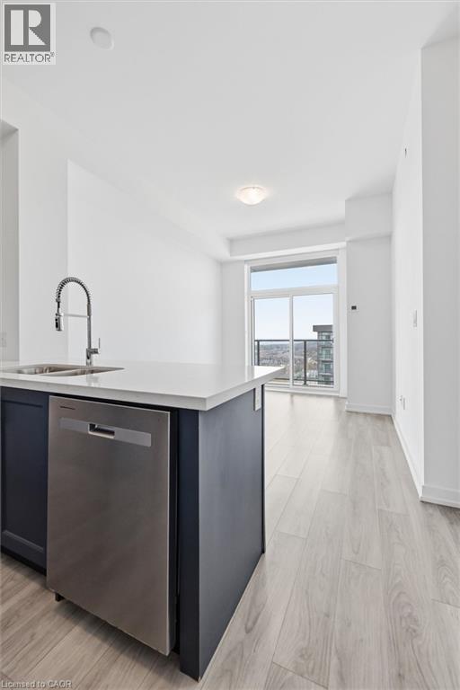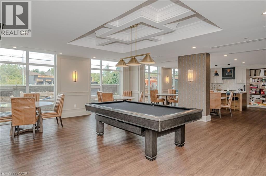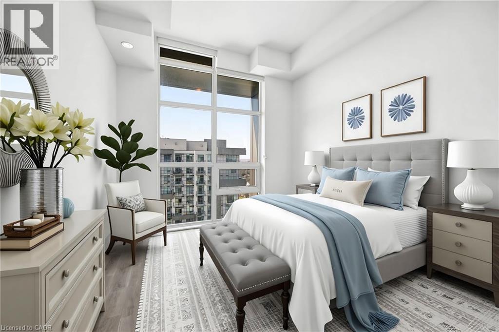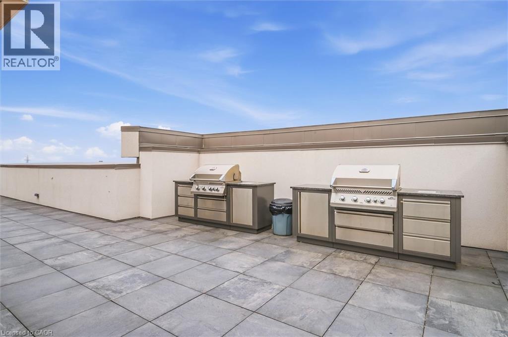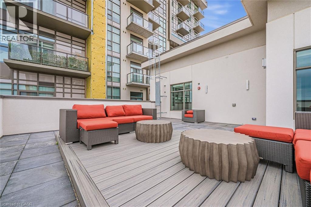 Experience elevated living in this stunning penthouse retreat perched on the top floor, offering 638 square feet of thoughtfully designed space. This 1 bedroom plus den residence impresses with soaring 10-ft ceilings and an abundance of natural light streaming through floor-to-ceiling windows. Step out to your private balcony and take in sweeping southwest panoramic views over the east end of Waterdown-the perfect backdrop for morning coffee or evening sunsets. The suite is loaded with quality upgrades, including custom navy cabinetry, gleaming white quartz countertops with an extended breakfast bar, upscale stainless steel appliances, a timeless subway tile backsplash, and top-of-the-line vinyl flooring that blends durability with contemporary style. Residents enjoy exceptional building amenities, including a rooftop terrace with BBQ, stylish party room, fully equipped gym, and convenient bicycle storage locker. Geothermal heating/cooling ensures energy efficiency and low utility costs year-round. Complete with 1 underground parking space and 1 storage locker, this residence offers comfort, convenience, and sophistication. This is more than a home-it's a lifestyle at the top, where modern design, smart efficiency, and breathtaking views come together seamlessly. (id:64869)